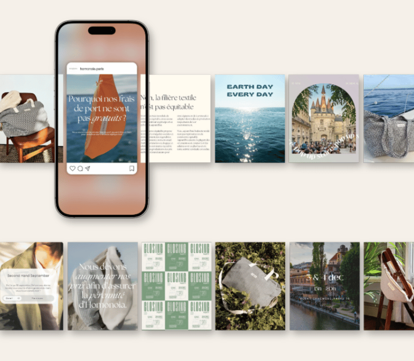 I led the complete development of Homonoia Paris's brand identity over five years, from market research on ethical fashion to defining its visual and messaging strategy. I crafted a cohesive narrative and visual system — including eco-friendly packaging, social media templates, product tags, professional photography, and collection visuals — ensuring the brand’s sustainability and social impact values were consistently communicated across all touchpoints. Over this period, I created 100+ brand assets, strengthening brand recognition, consistency, and storytelling across all channels, and providing a solid foundation for audience engagement and long-term growth.